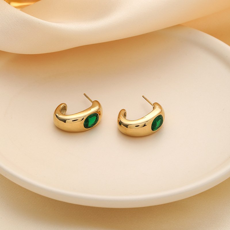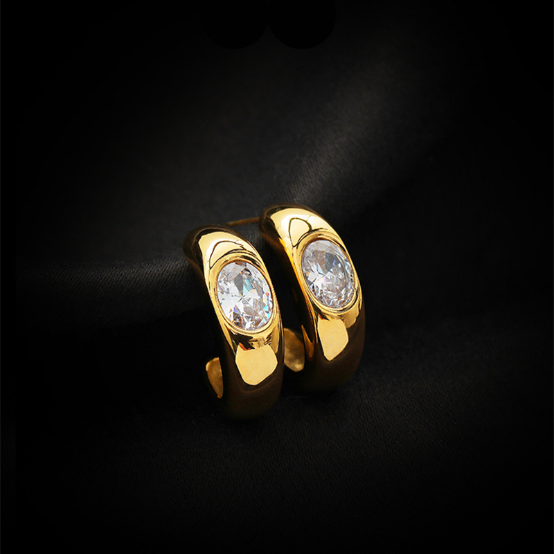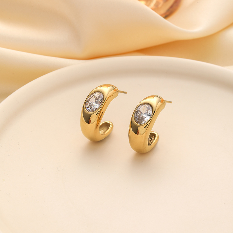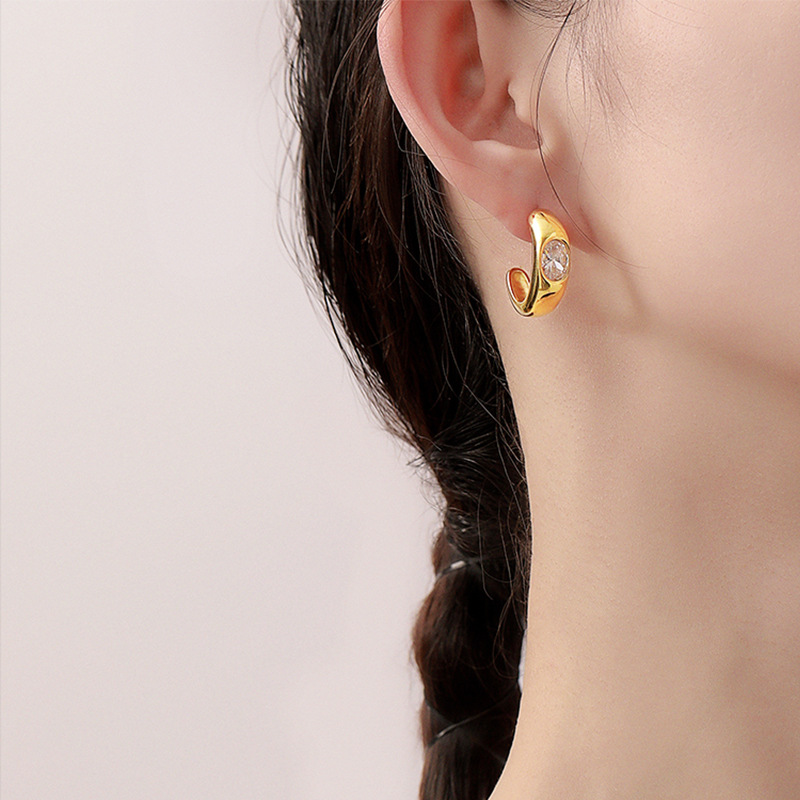 Pendientes en forma de C para mujer, diseño exclusivo de estilo INS, con zirconia, baño de oro K, acero titanio, no se desvanecen
